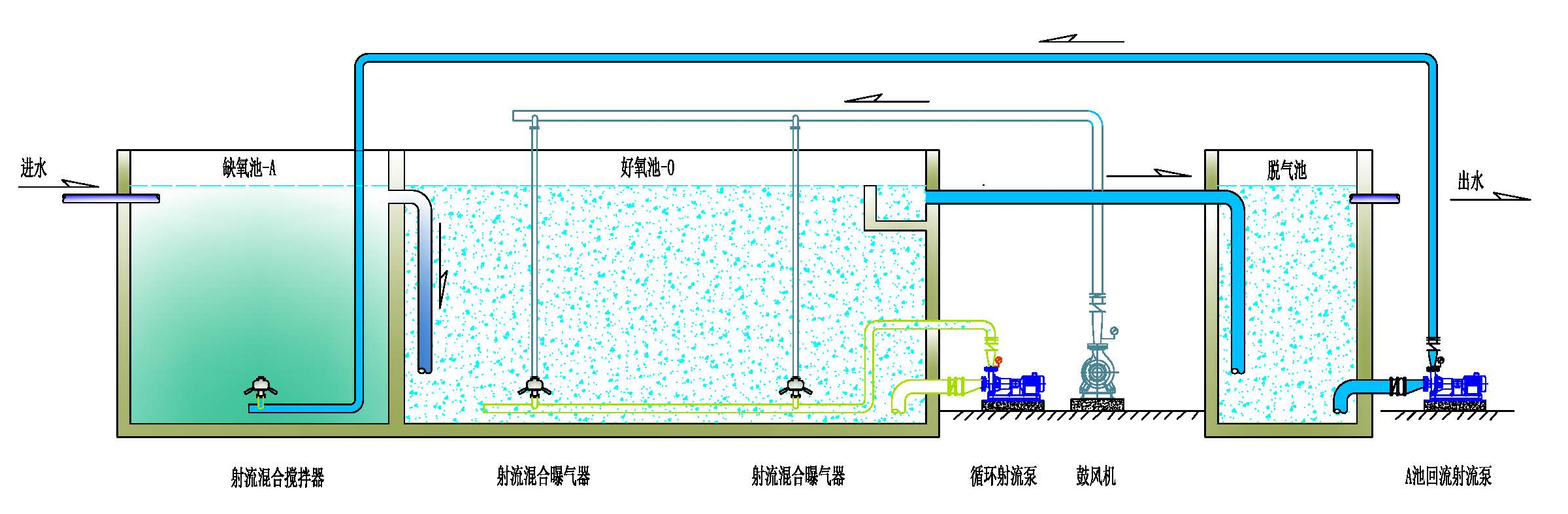 BIC-JXMT射流混合攪拌器通過射流臂導(dǎo)流環(huán)、混合液分配腔擾流柱等新穎設(shè)計(jì),能使攪拌池混合液在射流器內(nèi)產(chǎn)生較高強(qiáng)烈的紊動(dòng)、攪拌、剪切,促使攪拌池混合液充分混合,同時(shí)射流在高速前進(jìn)過程中,混合腔及括散腔內(nèi)高速旋轉(zhuǎn)的作用下,具有較高的角速度,使射流具有較強(qiáng)的穿透力,從而增強(qiáng)了混合攪拌能力。
